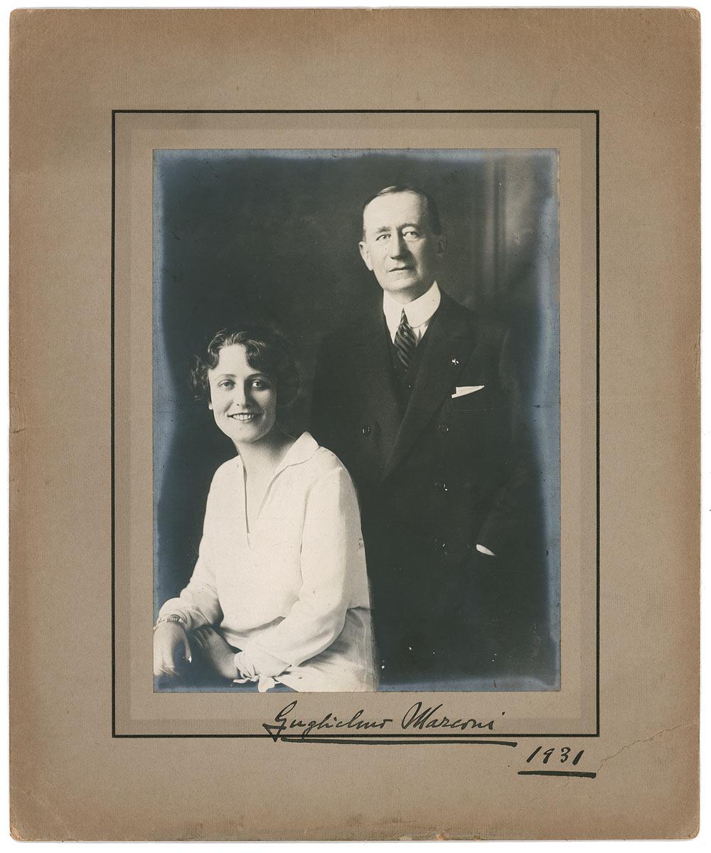 Nobel Prize–winning, Italian-born engineer (1874–1937) whose development of “wireless telegraphy,” better known to the world at large as radio, would come to exert a profound and immeasurable influence not only on communications, but on modern civilization itself. Vintage matte-finish 6 x 8 photo of Marconi and his daughter Elettra affixed to its original 10 x 12 photographer’s mount, signed in fountain pen, “Guglielmo Marconi 1930.” A bisecting horizontal crease, silvering to edges of image, and several creases and toning to mount, otherwise very good condition. Pre-certified PSA/DNA and RRAuction COA.