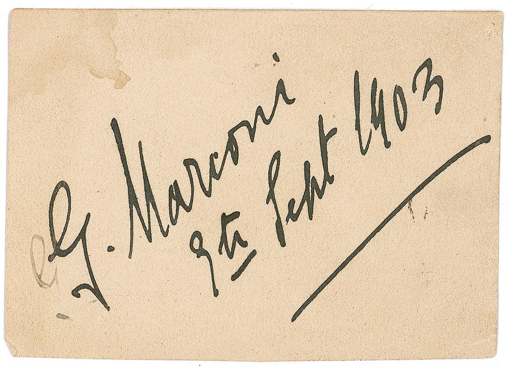 Ink signature, “G. Marconi, 9th Sept. 1903,” on an off-white 3.25 x 2.5 slip. Uniform toning, and some scattered light soiling, otherwise fine condition.