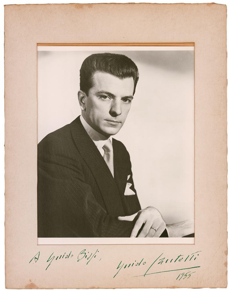 Italian orchestral conductor (1920–1956) who died at the age of 36 in a plane crash in Paris. Vintage matte-finish 8 x 10 photo, matted to an overall size of 10 x 13.5, signed and inscribed in green fountain pen on the mat “A Guido Bissi, Guido Cantelli 1955.” Scattered light toning and creasing to mat, as well as a bit of scattered light surface loss, a diagonal crease to photo, and some mild rippling along top edge, otherwise fine condition.