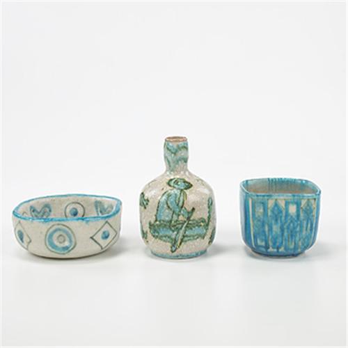 Set includes vase and two bowls. Glazed signature and donkey mark to underside of each example.