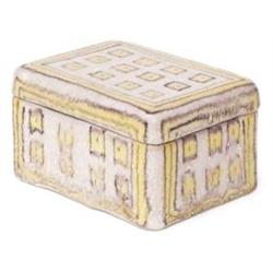 Guido Gambone covered box, Italy, 1950s, heavy stoneware form with yellow and brown geometric decoration under a thick glaze, signature and donkey mark, 5.75”w x 4.5”d, mint condition