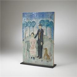 Guido Gambone plaque Italy, 1943 glazed earthenware and stand 12.25"w x 18.5"h Guido Gambone began his artistic career as a painter. This early ceramic shows his original approach was to literally treat the clay as canvas for his pictorial image. Signed and dated in the glaze. Literature: Guido Gambone: Tra Ceramica E Pittura, Caserta & Scontrino, painting illustrated pg. 81