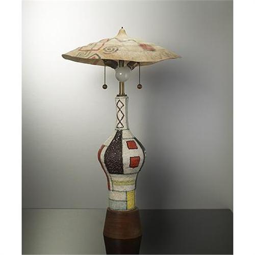 An excellent example of his work, this important lamp by Gambone features the original hand-painted shade. Glazed donkey mark and signature to underside: [Gambone Italy].<BR><BR>Condition of the item is not included in this description. Condition reports are available from Wright upon request. Wright strongly recommends that you review a condition report for each item on which you plan to bid.