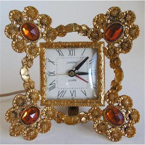 Produced circa 1950, this exceptional ornate, filigree and glass jeweled dresser or vanity Guild Crest electric alarm clock has a pattern of intricate ormolu flowers that surround each glass jewel. The clock features TELECHRON electric movement and is so marked on the back. The cord, which might have been the original wiring, is old but not damaged and has a bakelite plug. - This clock is part of a large, luxurious and extravagant dresser set that consists of, in addition to the clock, two matching perfume canisters, a matching vanity box and a tray, with over 50 large glass jewels - all available in separate auctions.