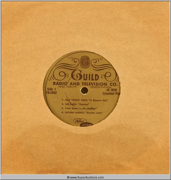 A Collection of Guild Radio & Television Co. 45 RPM Reject Records c. 4/18/1957 / Sample Artist-Songs: Nat King Cole "A Blossom Fell" ~ Shostakovich "Concerto in C Minor" ~ Les Paul "Carioca" / Original box has wear and is torn