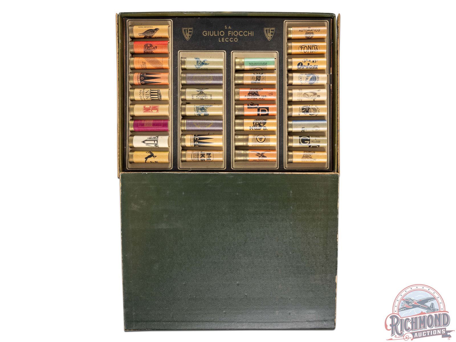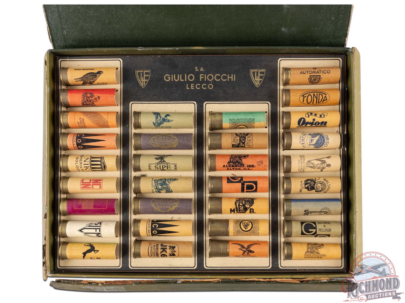 1950's vintage Guilio Fiocchi Shotgun Shell salesman's kit with Fiocchi entire line of paper 12 gauge shotgun shells - 32 in all. Each shell is a primed empty and attached to cardboard case bearing Fiocchi label inside with hinged lid saying "Made in Italy".