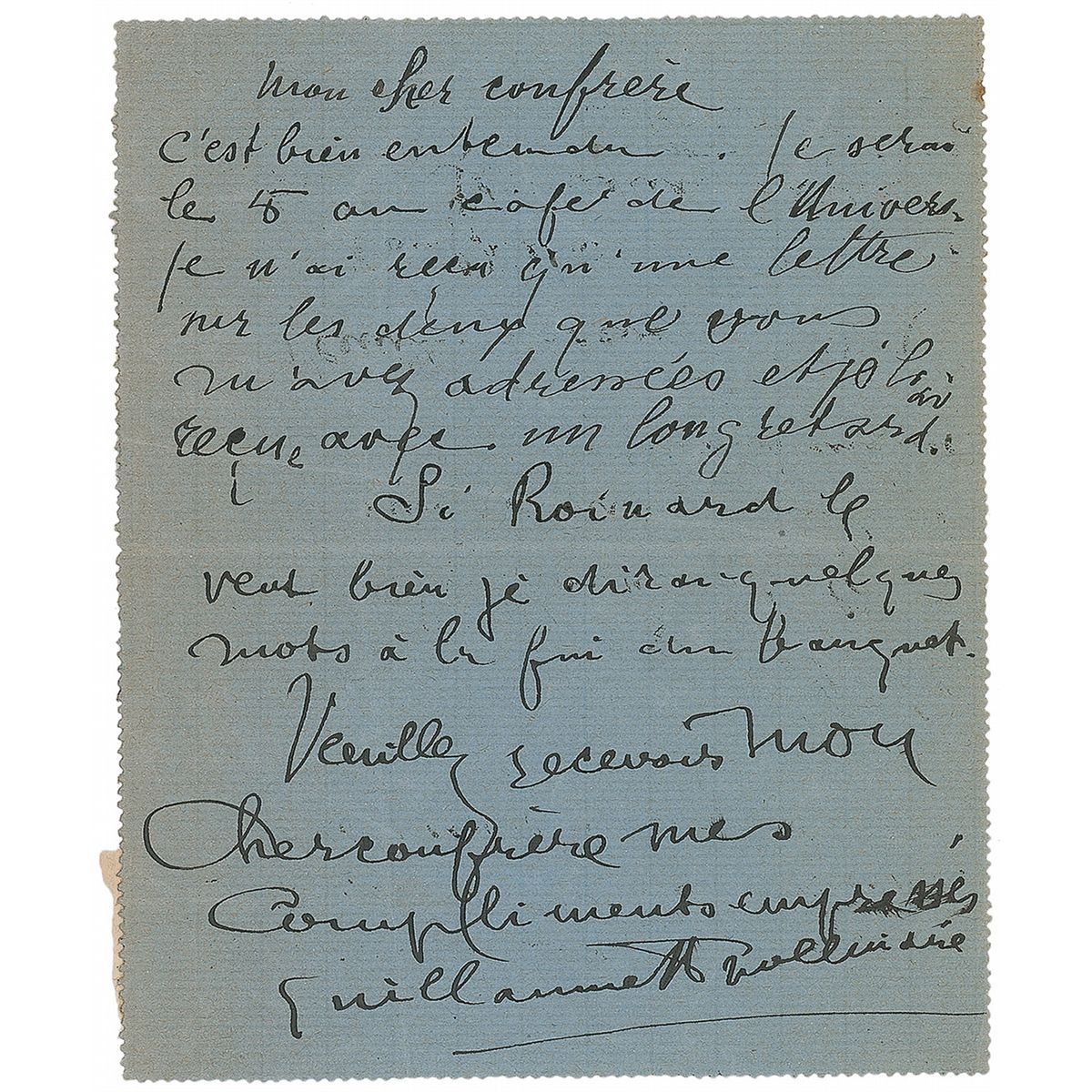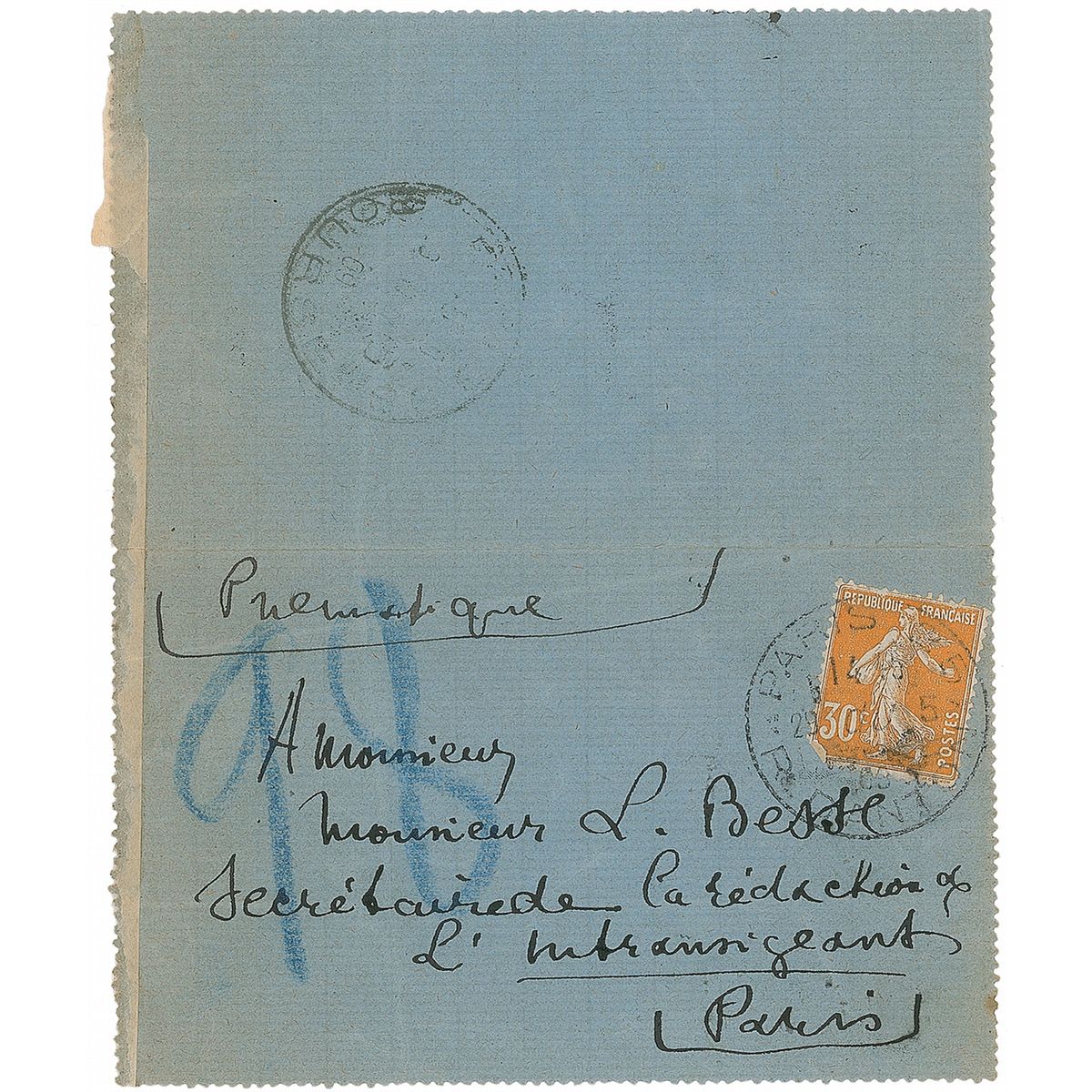Influential French poet and playwright (1880–1918) credited with coining the word ‘surrealism,’ writing some of the earliest works to be described as such. ALS in French, one page, 4.25 x 5.25, no date. Untranslated letter to a colleague, L. Besse, accepting an invitation to meet at a cafe and agreeing to say a few words at the end of the banquet if “Roinard” wants. Toning and a couple tiny tears to edges, and slight mirroring and brushing to ink, otherwise fine condition. Paul-Napoleon Roinard was a painter, poet, and close friend of Apollinaire. They had co-authored La Poesie Symboliste together in 1908, which contained lectures delivered at the Salon des Artistes Independants. A very scarce letter from the poet who would be wounded in World War I and never recover before succumbing to the Spanish flu pandemic of 1918 at age 38.