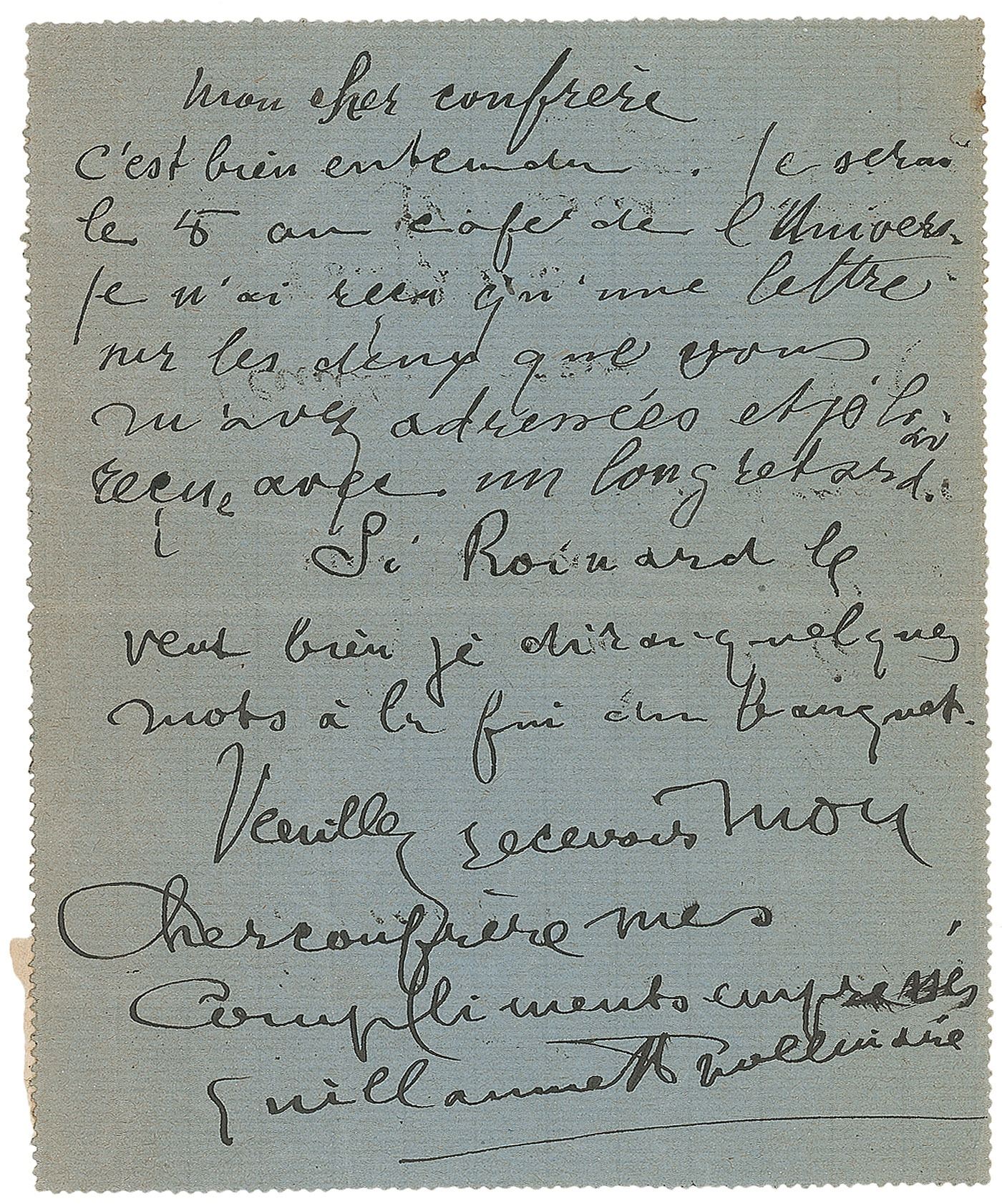 Influential French poet and playwright (1880–1918) credited with coining the word ‘surrealism,’ writing some of the earliest works to be described as such. ALS in French, one page, 4.25 x 5.25, no date. Untranslated letter to a colleague, L. Besse, accepting an invitation to meet at a cafe and agreeing to say a few words at the end of the banquet if "Roinard" wants. Toning and a couple tiny tears to edges, and slight mirroring and brushing to ink, otherwise fine condition. Paul-Napoleon Roinard was a painter, poet, and close friend of Apollinaire. They had co-authored La Poesie Symboliste together in 1908, which contained lectures delivered at the Salon des Artistes Independants. A very scarce letter from the poet who would be wounded in World War I and never recover before succumbing to the Spanish flu pandemic of 1918 at age 38.