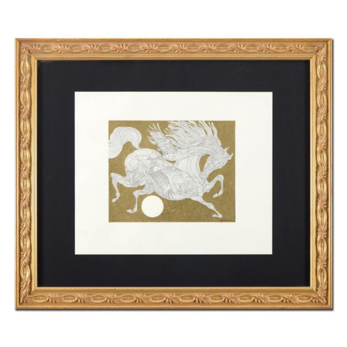 "Cranes" is an original pen and ink drawing on paper with hand laid gold leaf by Guillaume Azoulay, hand signed by the artist. This piece is framed. Includes Letter of Authenticity. Measures approx. 27" x 23" (frame); 10" x 8" (image). Reference #: 239515