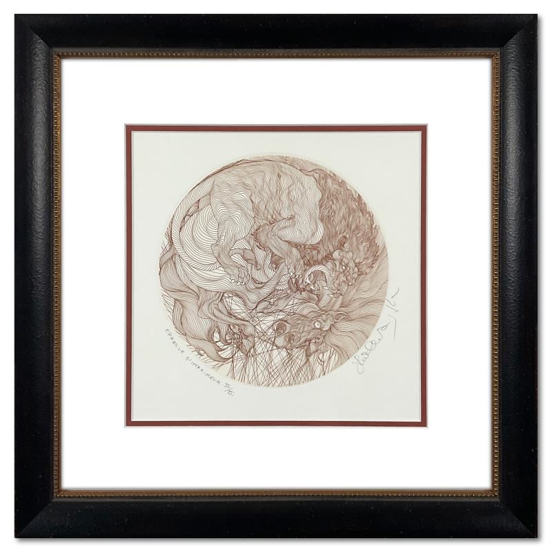 "Leo" is a limited edition etching on paper by Guillaume Azoulay, numbered II/II and hand signed by the artist. This piece comes custom framed. Includes Letter of Authenticity. Measures approx. 19.5" x 19.5" (frame), 9" (image-diameter).