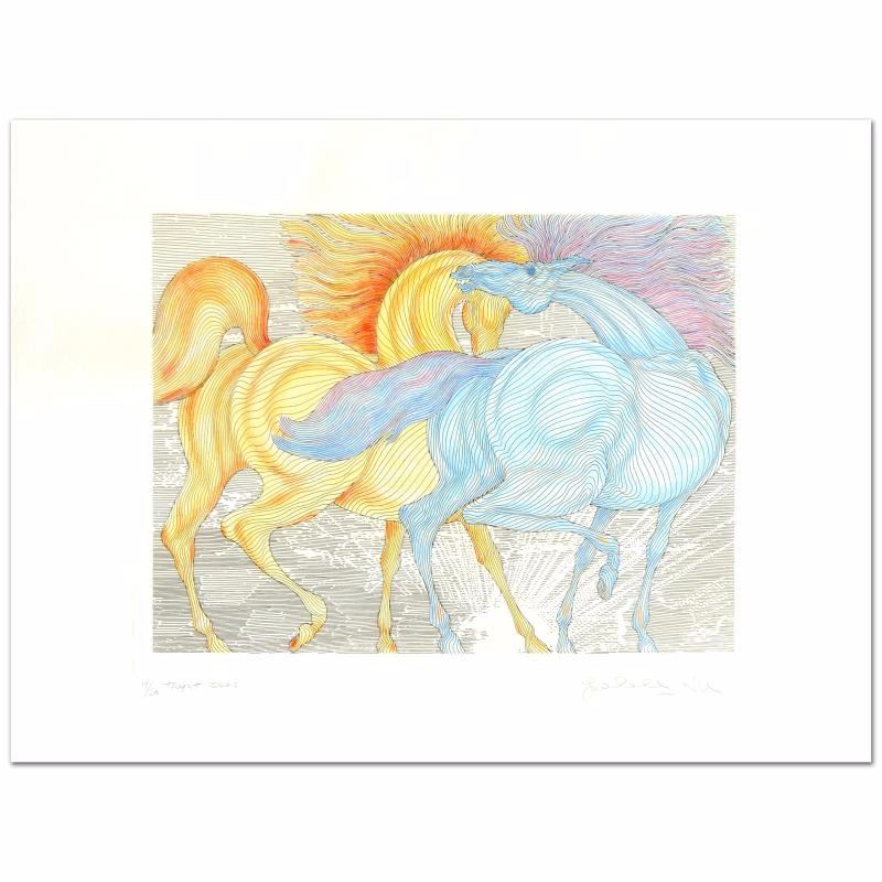 "Tryst" is a limited edition hand-watercolored etching on paper by Guillaume Azoulay! This piece is numbered and dated (2015), and hand signed by the artist. Includes Certificate of Authenticity! Measures approx. 29.5" x 22.5" (with border), 20" x 15" (image). Retail Price $3000.00. PRICE INCUDES FREE SHIPPING IN THE U.S. - SHIPPING WILL BE ADDED TO YOUR INVOICE FOR ALL BUYERS OUTSIDE OF THE U.S.