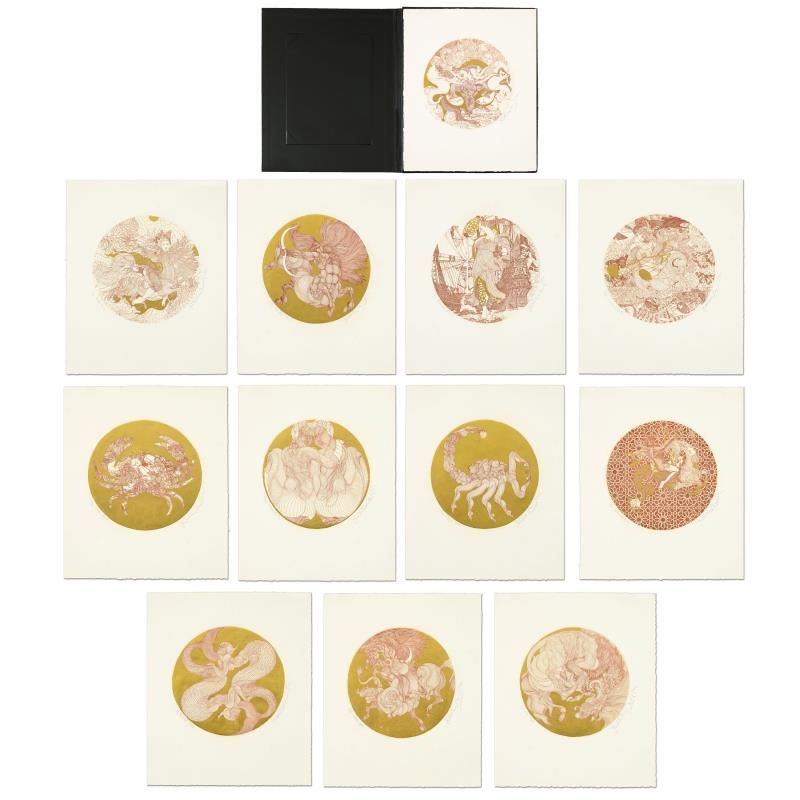 "Zodiac Suite" is a 12 piece suite of limited edition etchings (sepia) with gold leaf on paper by Guillaume Azoulay. Each piece is numbered 1/30 and hand signed by the artist. Measures approx. 13" x 16" (border), 9" x 9" (image).