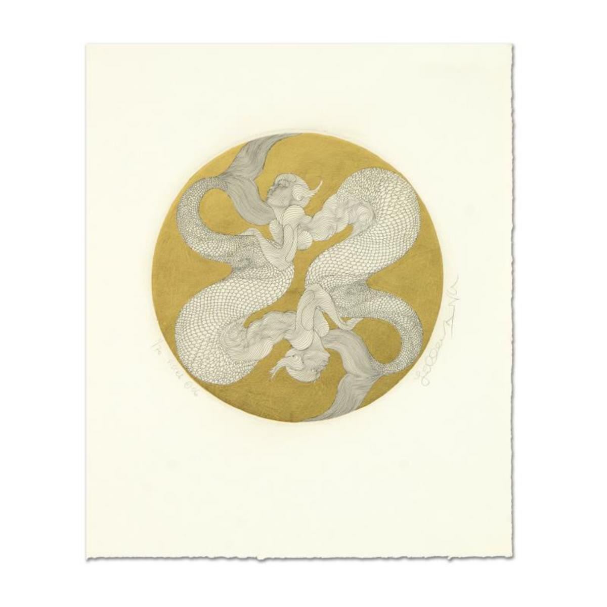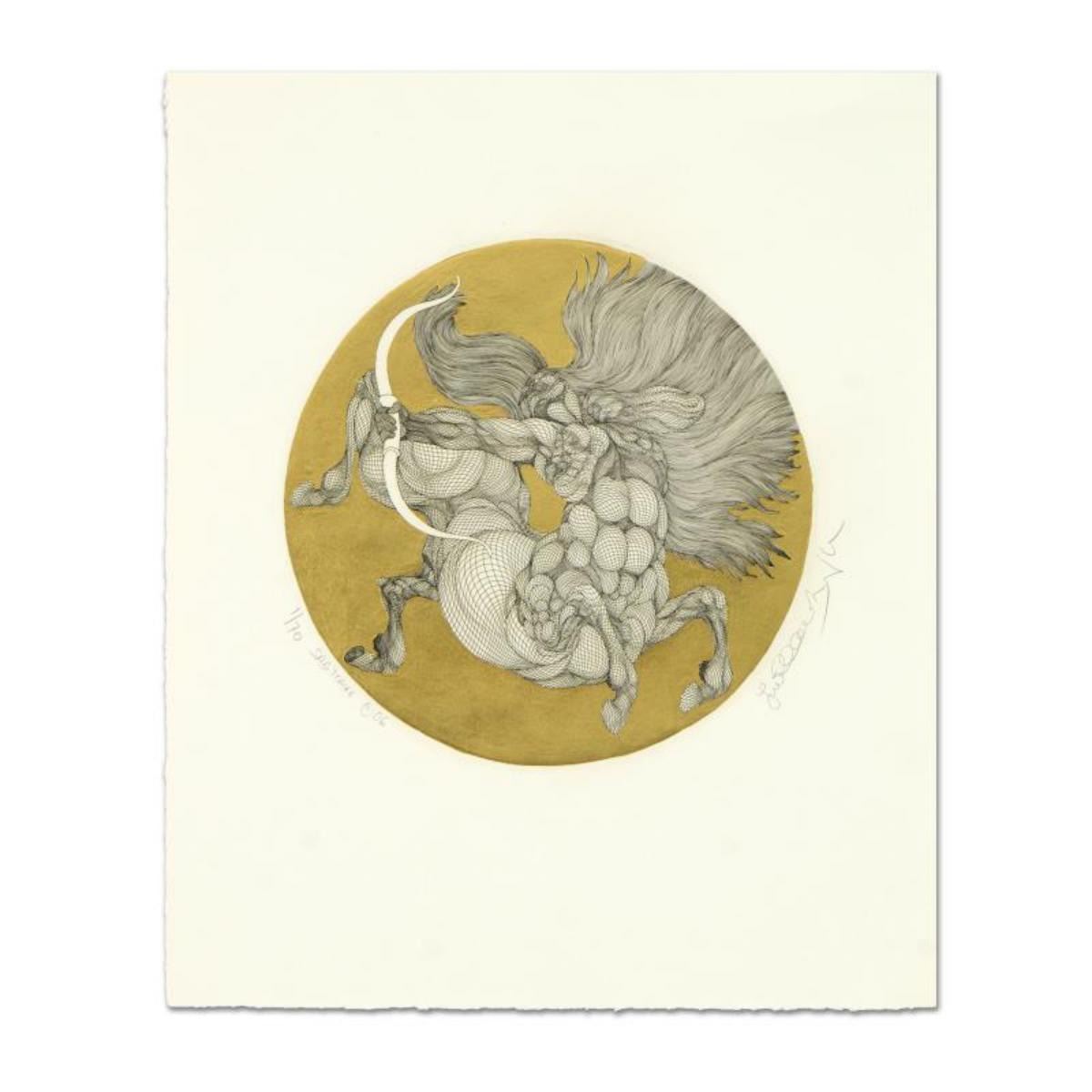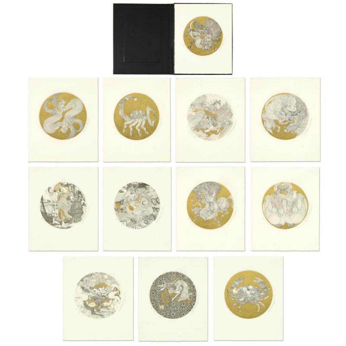 "Zodiac Suite" is a 12 piece suite of limited edition etchings (black) with gold leaf on paper by Guillaume Azoulay. Each piece is numbered 1/70 and hand signed by the artist. Measures approx. 13" x 16" (border), 9" x 9" (image). Reference #: 240024