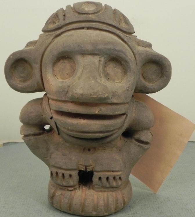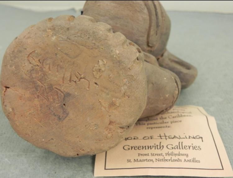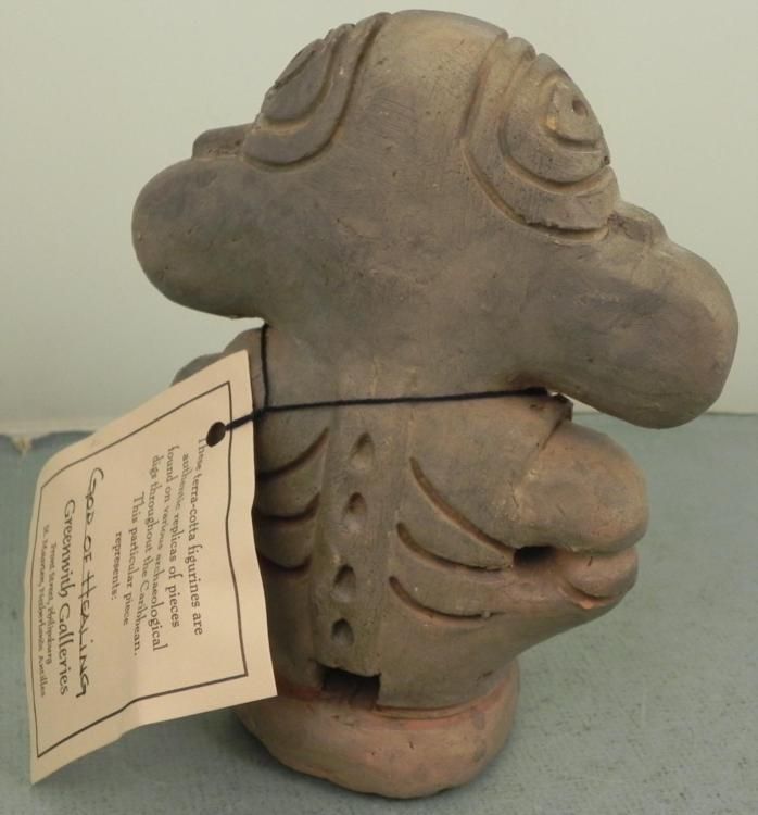 This original figurine is an authentic replica of a piece found on an archaeological dig in the Carribean. * Artist: Guillen A.D. * Signature: Etched on the bottom * Name: God of Healing * Medium: Terra-cotta * Gallery: Greenwith Galleries * Dimensions: 6" inches tall, 5" wide * Condition: Excellent, with original tag