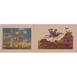 LUNA DE MIEL, 1966, color etching, signed in pencil and inscribed 'A-8', image 9 1/4 x 14", full margins, a few tiny foxing speckles; EN BUSEA DE UNE FLOR, 1968, color etching, signed in pencil, from the numbered edition 100, image 8 3/4 x 11 3/4", full margins, some scattered foxing speckles. (2) STARTING BID $20. ESTIMATE $20 TO $1000