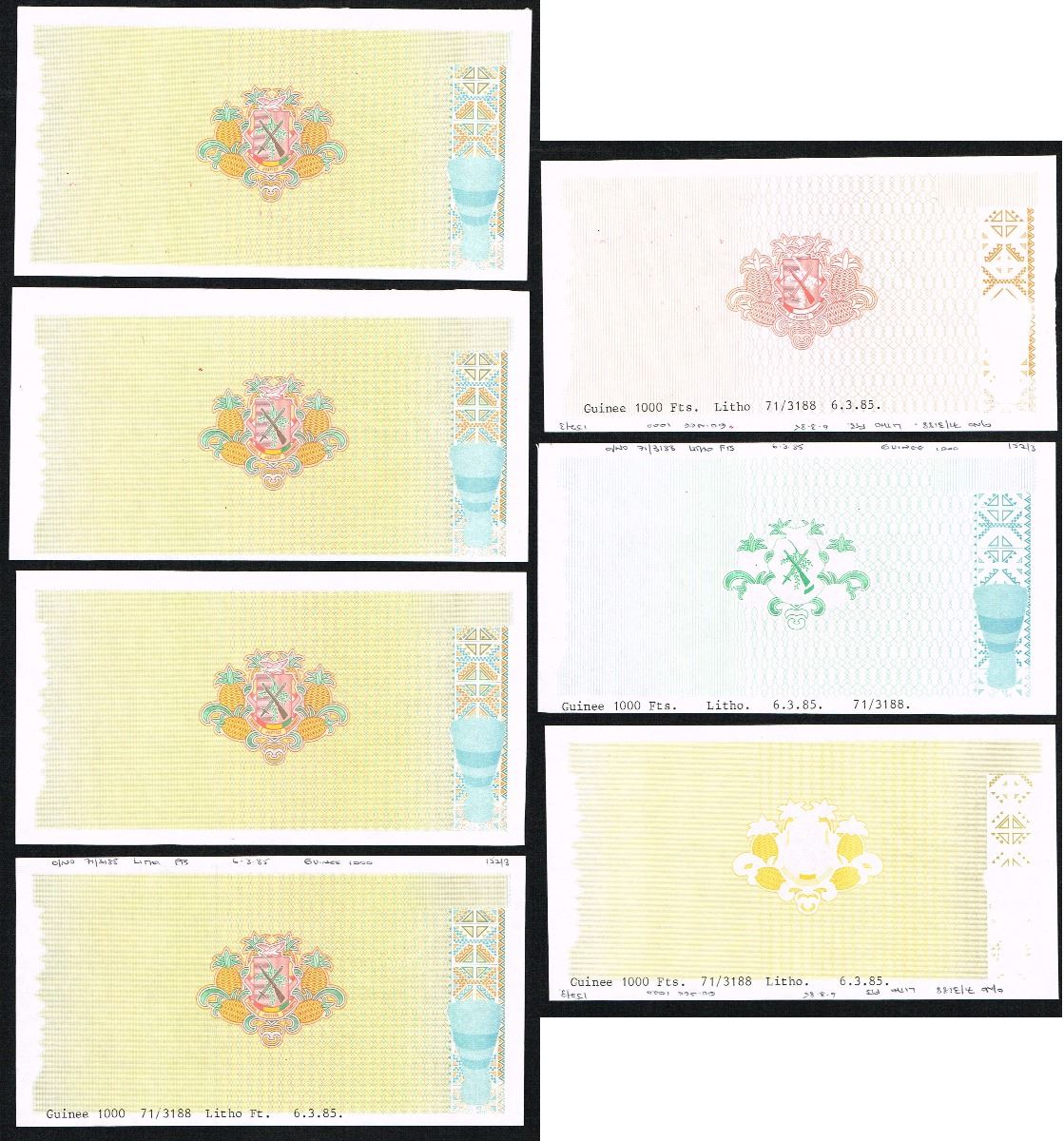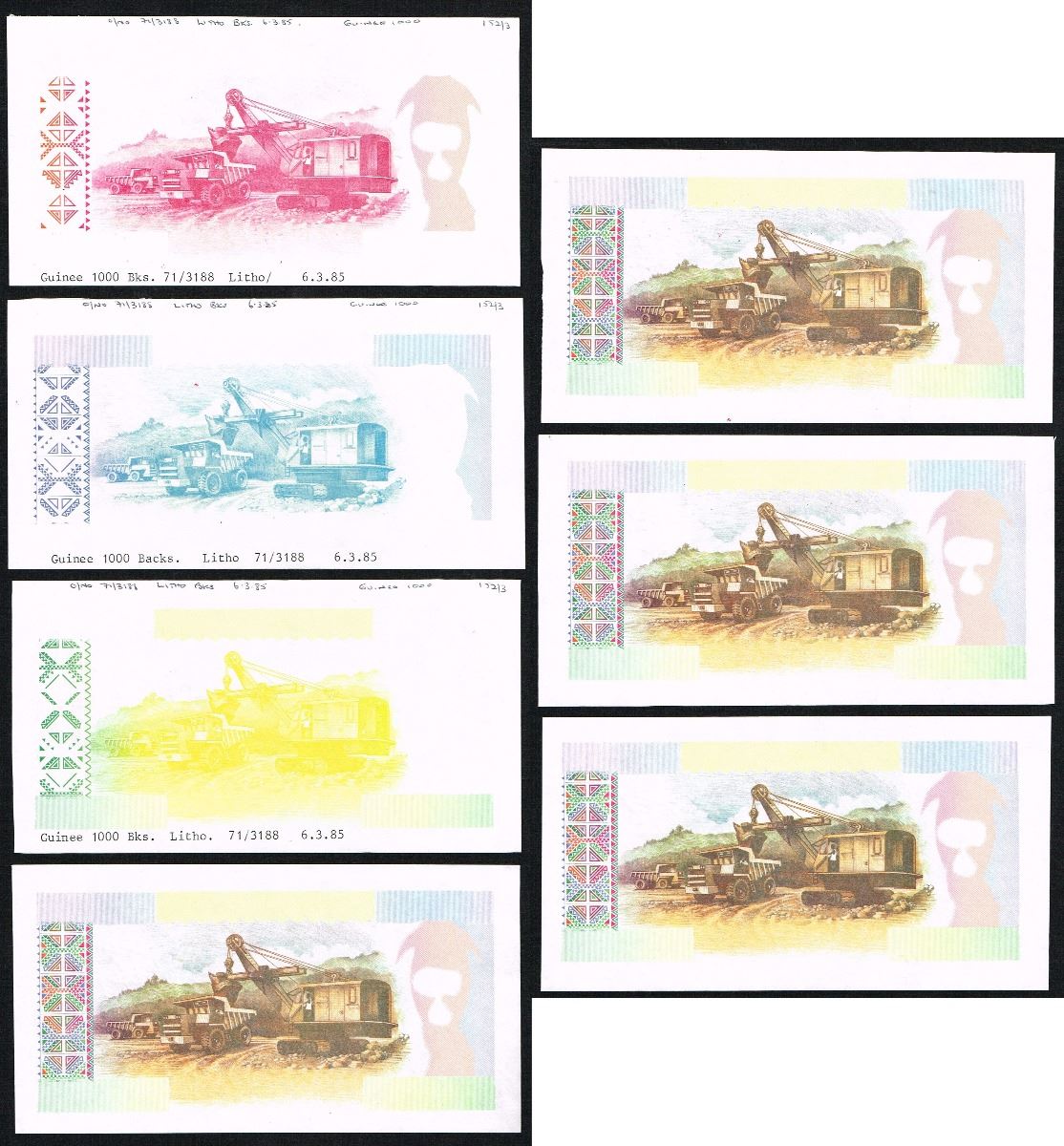 Guinea, 1000 Francs, 1985, Pick# 32, PROGRESSIVE PROOFS 7 PCS, Banque Centrale, SL# 000000, UNC