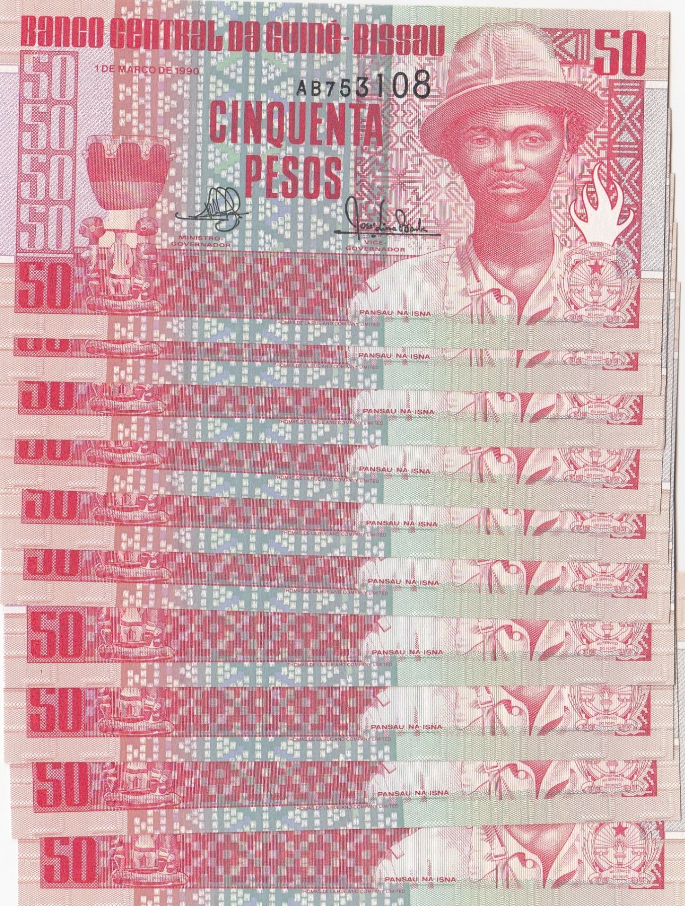 Guinea-Bissau, 50 Pesos, 1990, UNC, p10, (Total 10 consecutive banknotes)br/serial numbers: AB 753108- 17