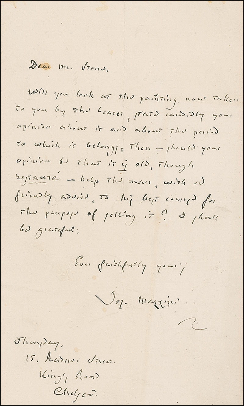 Italian patriot (1805–1872) who dedicated his life, much of which was spent in exile, to uniting his country under a republic. ALS signed “Jos. Mazzini,” one page, 4.25 x 7, no date. Letter to Mr. Stone. In part: “Will you look at the painting now taken to you by the bearer, state candidly your opinion about it and about the period to which it belongs. Then—would your opinion be that it is old…help this man, with…friendly advice, to his best course for the purpose of selling it? I shall be grateful.” Central horizontal and vertical fold, lightly affecting signature, some scattered light toning and soiling, and a few wrinkles, otherwise fine condition.