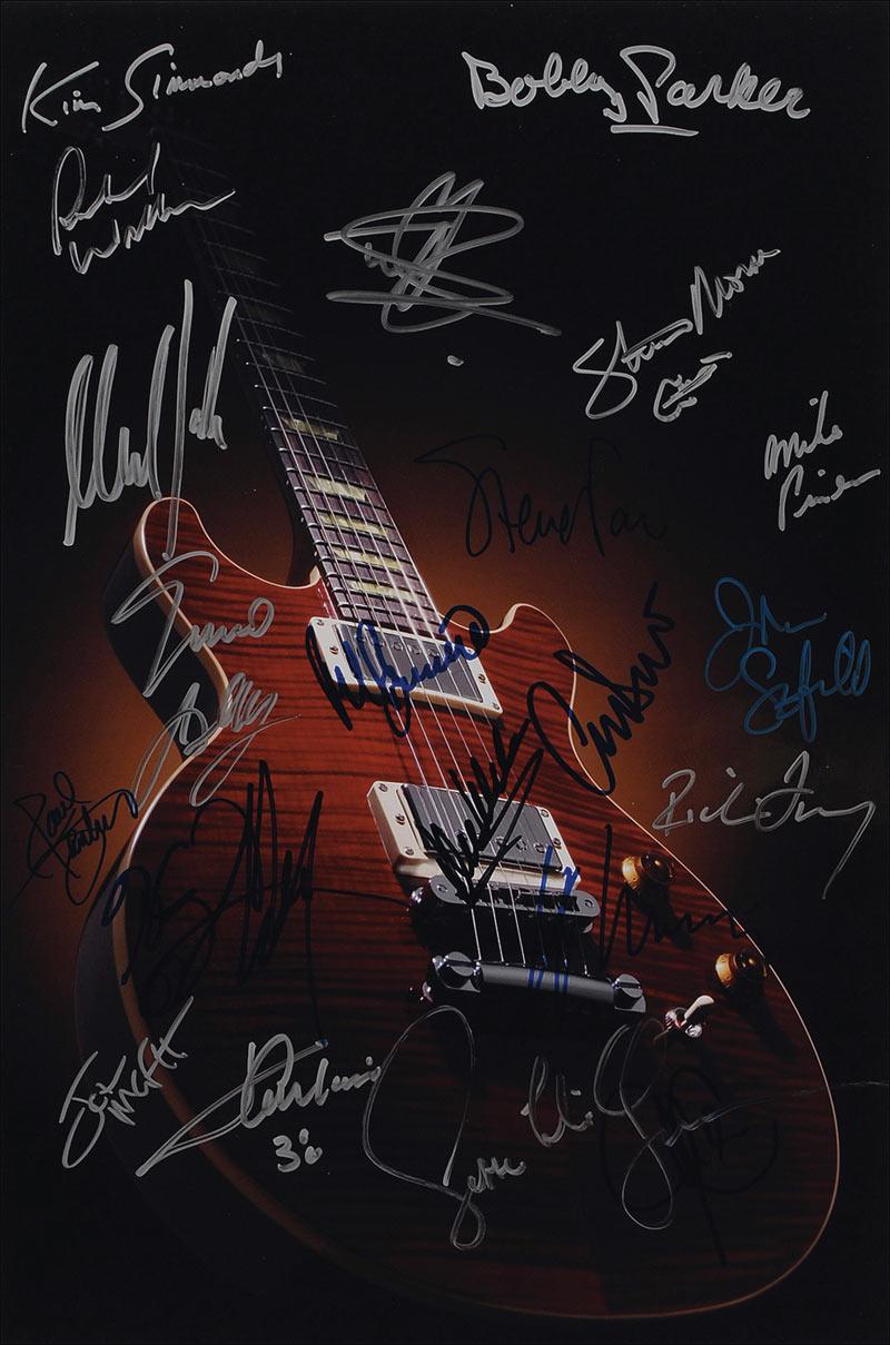 Color glossy 12 x 18 artistic photo of an electrical guitar, signed in blue or silver ink by 21 guitar greats. Signers are: Mick Taylor (Rolling Stones), Steve Vai, Don Wilson (The Ventures) Paul Kantner (Jefferson Airplane), K. K. Downing (Judas Priest), Neal Schon (Journey) Tim Farriss (INXS), Ernie Isley (Isley Brothers), Richie Furday (Buffalo Springfield), Harvey Mandel (Canned Heat), Steve Morse (Dixie Dregs), Chris Dreja (Yardbirds), Kim Simmonds (Savoy Brown), Paul Barrere (Little Feat), John Scofield, Jesse Colin Young (Youngbloods), Mike Pinera (Iron Butterfly and Blues Image), John McFee (Doobie Brothers), Jeff Carlise (.38 Special), Jonathan Cain (Journey), and Bobby Parker. In fine condition with two of the signatures overlapping.