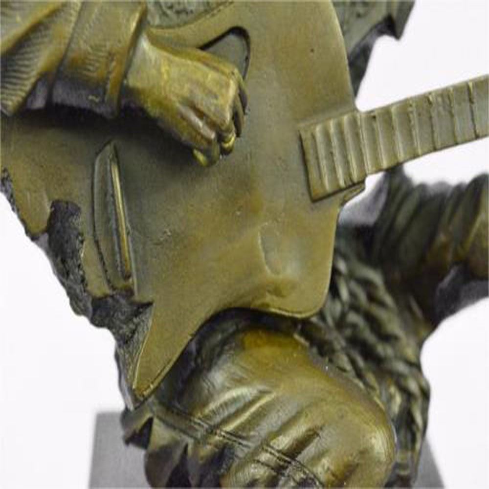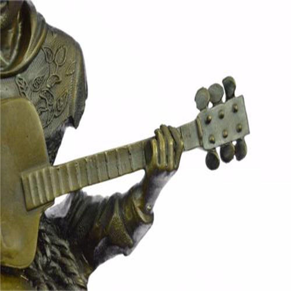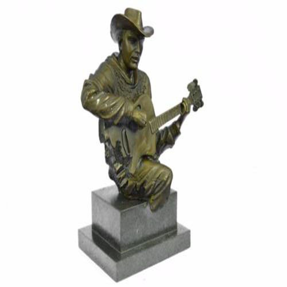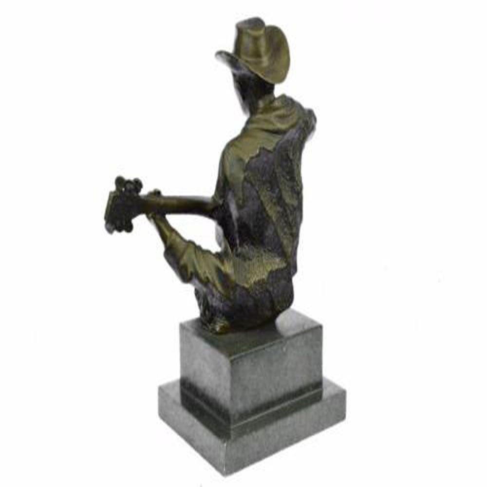 This amazing and creative Detailed of a cowboy musician playing his Guitar is exquisite. He is made with the creation of your imagination. His eyes are concentrating on each string he touches, making sure he dont make a mistake. This very fine and unique abstract was casted using the ancient old Lost Wax Method stained in brown patina finish for preservation and mounted atop a black marble base. Bronze Dimensions with Marble Base: Height 9 X Width 9 inches. Weight: 8 LBS.