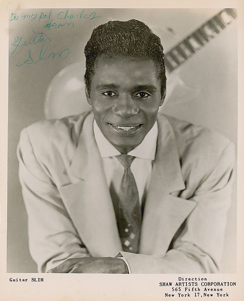 New Orleans blues guitarist (1926–1959). Vintage glossy 8 x 10 publicity photo, signed and inscribed in green ballpoint “To my pal Charles from Guitar Slim.” In very good condition, with a couple creases, a bit of light skipping to signature and inscription, and an impression from another signature and inscription from an item placed on top of the photo.