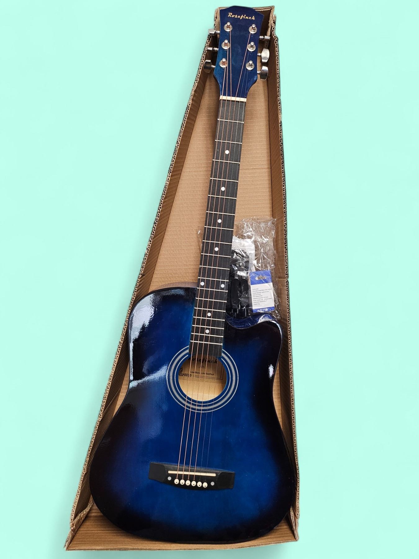 Rosefinch blue guitar beginner kit with bag, tools, tuner and strings.