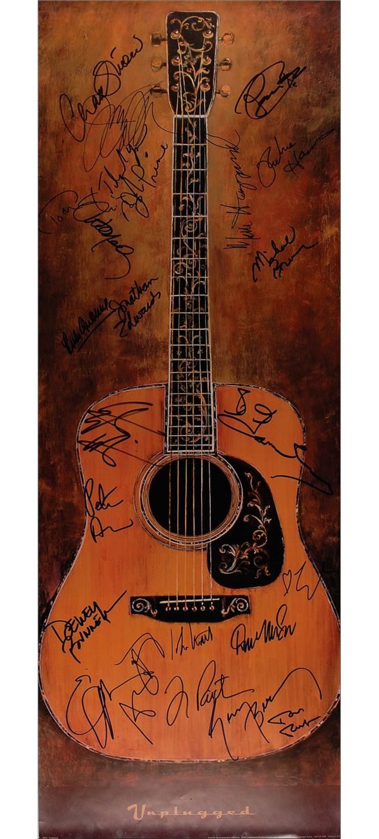 Color 13.5 x 37.5 print, titled ‘Unplugged,’ signed in felt tip by 23 acoustic musicians: Willie Nelson, Arlo Guthrie, Merle Haggard, John Prine, Don McLean, Richie Havens, Judy Collins, Chad Stuart and Jeremy Clyde, Emmylou Harris, America’s Gerry Beckley and Dewey Bunnell, Tom Shipley and Michael Brewer, Peter Asher and Gordon Waller, Indigo Girls’ Amy Ray and Emily Sailers, John Hiatt, Tom Paxton, Tom Rush, Jonathan Edwards, and Edwin McCain. Rolled and in fine condition.