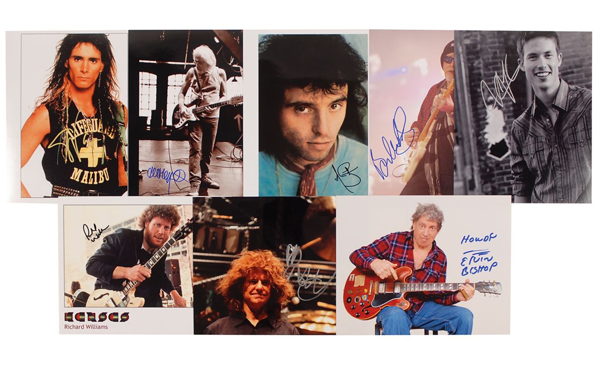 Eight signed photos, 8 x 10 and 10 x 8, various finishes, seven color, each signed in ink or felt tip by the respective guitarist pictured. Signers are: John Mayall, Elvin Bishop, Nils Lofgren, Steve Vai, Brad Whitford, Pat Metheny, Richard Williams, and Johnny Lang. In fine condition.