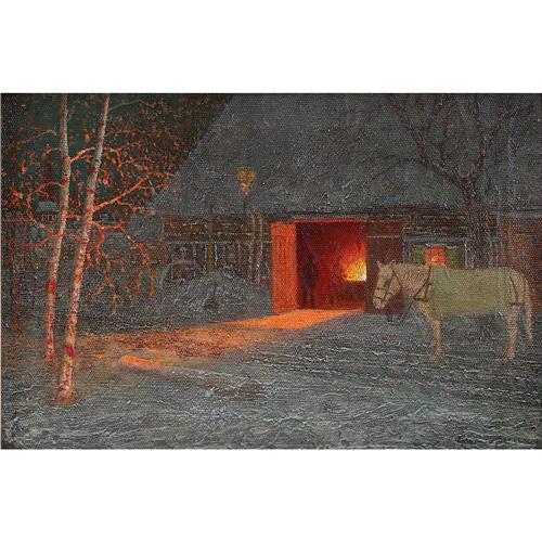 Gulbrand Sether (Norwegian/American, 1869-1941), "Night in the Barn", c. 1910; oil/canvas, 12.25" x 18.25", signed. Sether studied with Fritz Thaulow in Norway before emigrating to the U.S. in 1893. He worked in the Chicago area, painting mostly winter