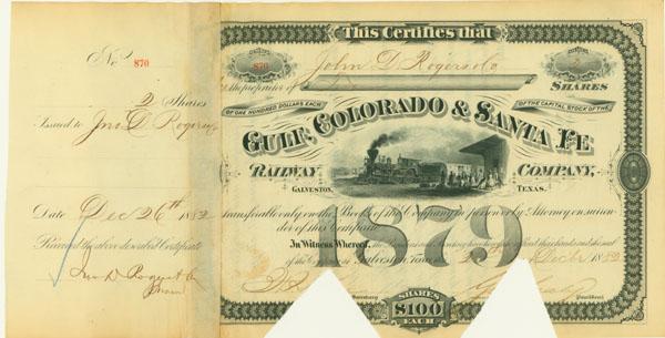 1882. Texas. Black/White. Stock certificate for 2 shares. Vignette of train at station at top center. Two large cut cancellations at bottom. Very fine.