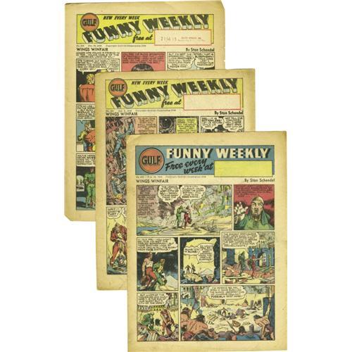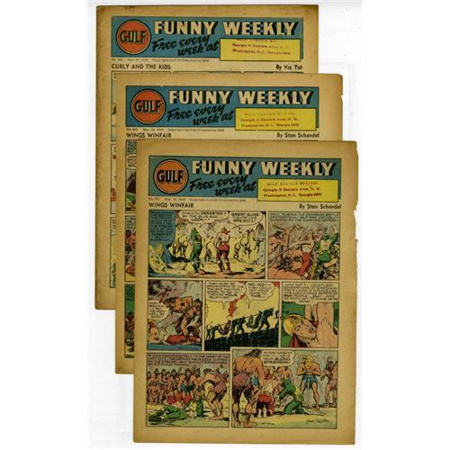 Given away each week at gas stations, these four-page comics sections containing original material are hard to come by today. This large group includes: #349 (VG+), 350 (VG+), 356 (FN), 357 (VG+), 360 (FN), 362 (FN/VF), 364 (FN), 367 (GD), 368 (FN), 370 (VG+), 371 (FN), 375 (VG+), 377 (FN), 380 (FN), 381 (VG+), 383 (FN), 384 (VG-), 385 (FN/VF), 386 (VG+), 387 (FN/VF), 388 (VG+), 389 (FN), 390 (FN), 393 (FN/VF), 396 (VG+), 397 (FN), 398 (PR), 400 (VG+), 402 (FN), 404 (FN/VF), 405 (FN), 407 (FN/VF), 411 (FN/VF), 415 (FN/VF), 416 (FN/VF), 417 (FN), 418 (VG+), 419 (FN/VF), 421 (FN/VF), and 422 (VG-). Approximate Overstreet value for group = $700. <I>From the Crippen Collection.</B></I><BR><BR><b>Shipping:</b> Books & Catalogs (<a target="_blank" href="http://www.heritageauctions.com/common/shipping.php">view shipping information</a>)