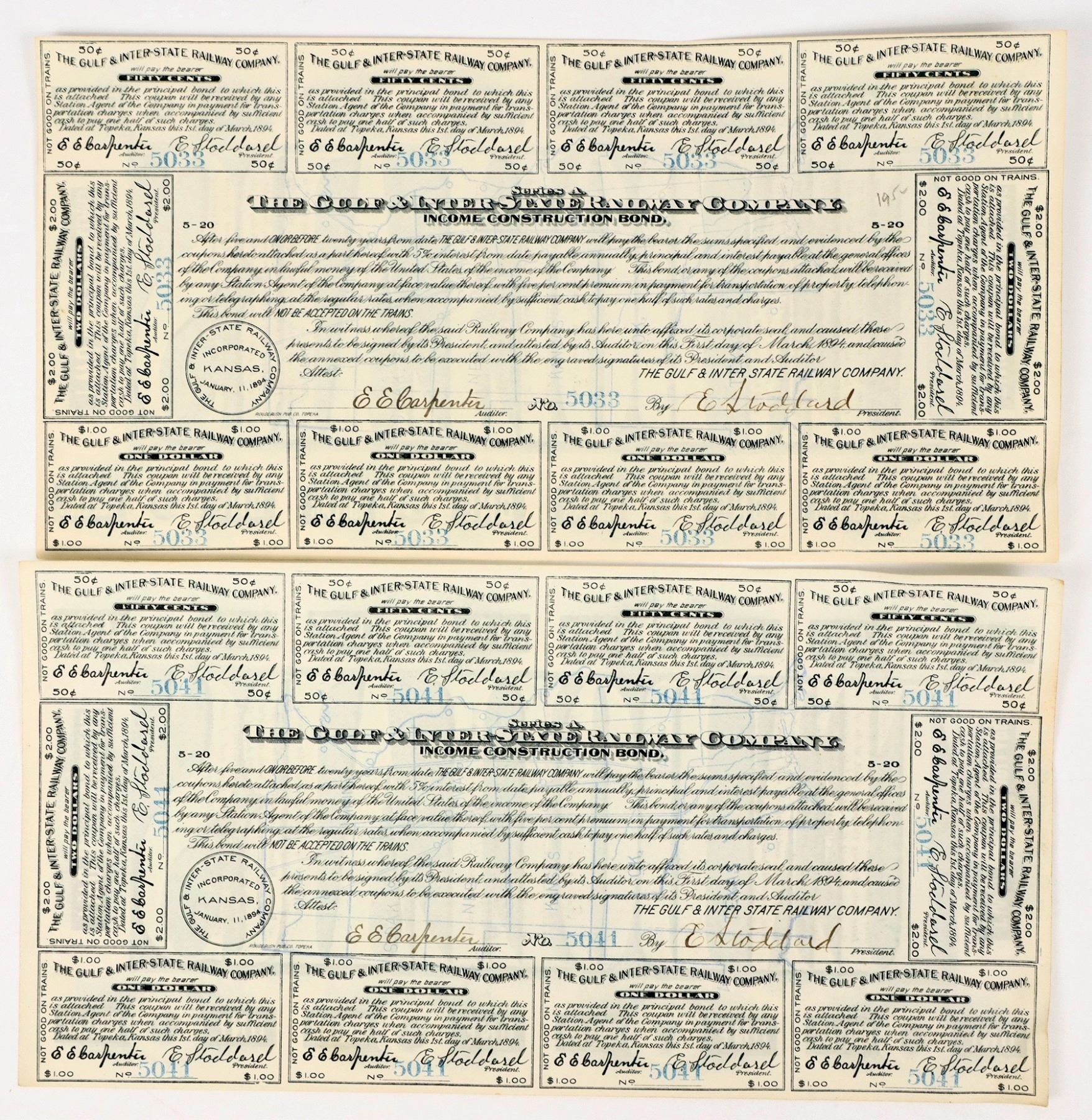 These are two issues of the Gulf and Inter-State Railway Company Bonds. Issued in the state of Kansas in 1894. Suitable for framing. Please see photo for details.