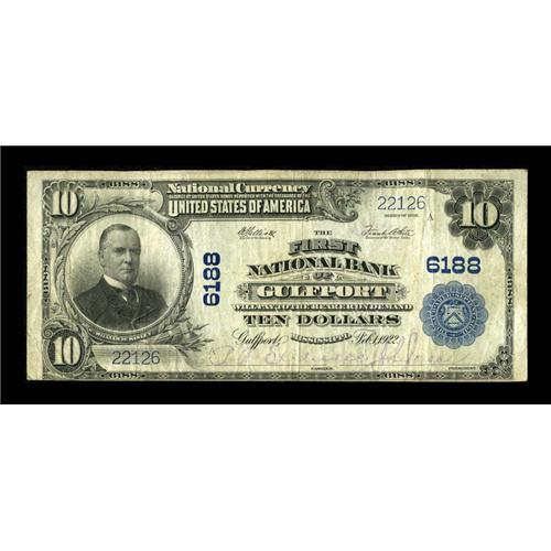 <B>Gulfport, MS</B></I> - $10 1902 Plain Back Fr. 634 <B>The First NB</B></I> Ch. # 6188<BR>This is a perfectly original <B>Very Fine</B></I> with bright, unadulterated paper. Two different plate dates were used for Gulfport Series 1902 Nationals. The bank was chartered in 1902 and the charter was renewed in 1922, explaining the two dates.<BR><BR><b>Shipping:</b> Coins & Currency (<a target="_blank" href="http://www.heritageauctions.com/common/shipping.php">view shipping information</a>)