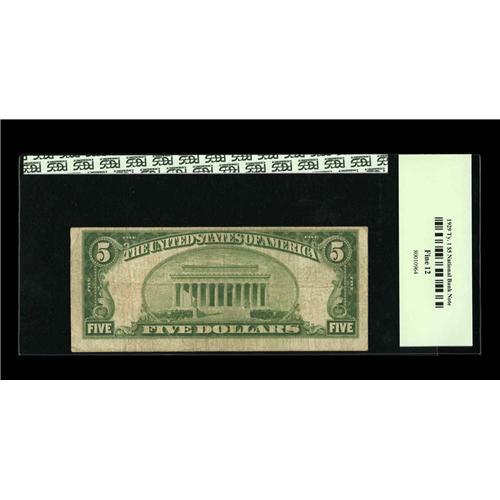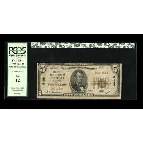 <B>Gulfport, MS</B></I> - $5 1929 Ty. 1 <B>The First NB</B></I> Ch. # 6188<BR>A <B>PCGS Fine 12</B></I> from a Mississippi coastal locale ravaged by Hurricane Katrina.