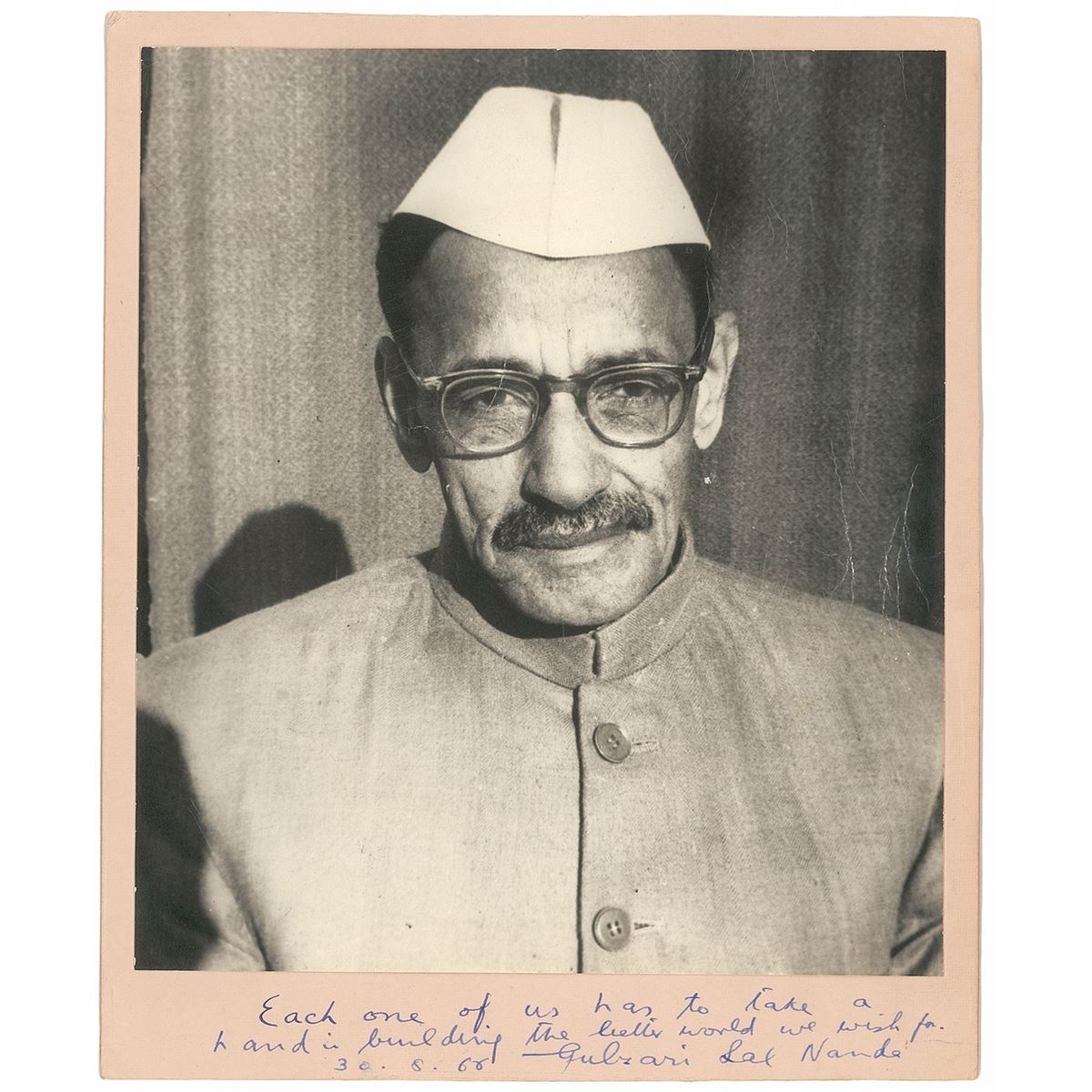 Indian politician and economist (1898–1999) who twice served as the Prime Minister of India during the mid–1960s. Matte-finish 7.5 x 8.75 head–and–shoulders portrait of Nanda, affixed to its original 8.25 x 10 mount, signed on the mount in blue ink, “Each one of us has to take a hand in building the better world we wish for, 30.8.60, Gulzari Lal Nanda.” In very good condition, with scattered creasing to the photo and light wear to the mount (a small crease affecting a portion of the writing).