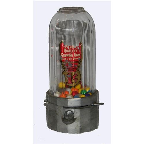 Gumball with decal indicating 1 Cent Quality Chewing Gum measures approx. 11" tall. The 14-sided cylinder sits on a similarly shaped base with a 5" diameter. Decal is worn, but still readable.