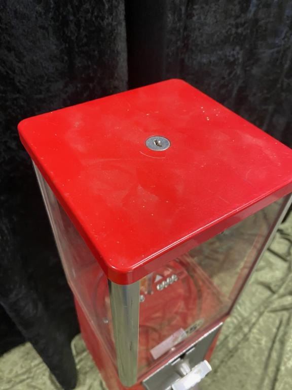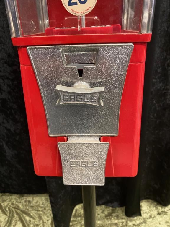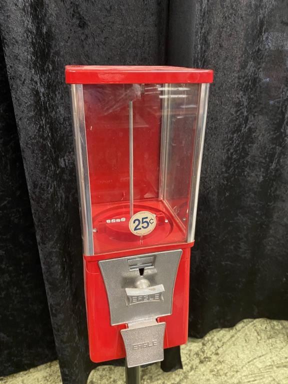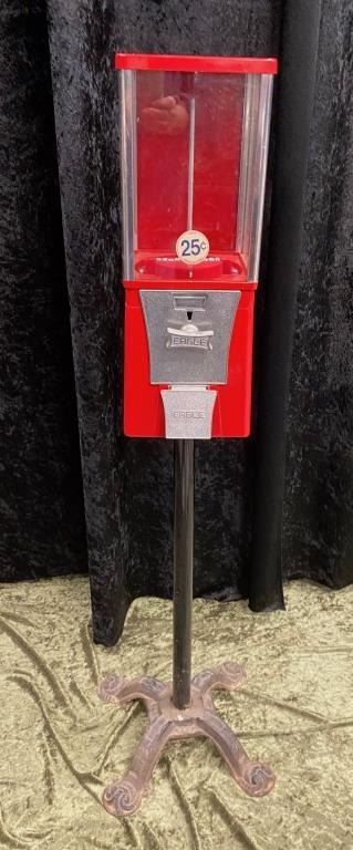 Gumball Machine on an older Iron stand. .25 cent. Good condition. Measures 43 1/2". 1960s-70s. Est.: $100-200