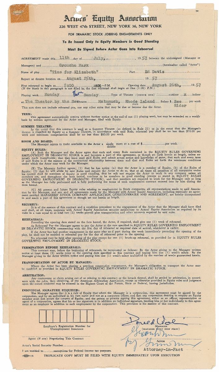 Uncommon DS, signed on behalf of his brother, “Groucho Marx by Gummo Marx,” three pages, 8.25 x 15, August 25, 1957. Actors’ Equity Association agreement for Groucho to appear in the role of Ed Davis in the play Time for Elizabeth at the Theater by the Sea, Matunuck, Rhode Island, in August 1957. An additional rider specifies further terms in fifteen points, each of which is also initialed by Gummo. In fine condition, with expected document wear. Accompanied by a full letter of authenticity from PSA/DNA.