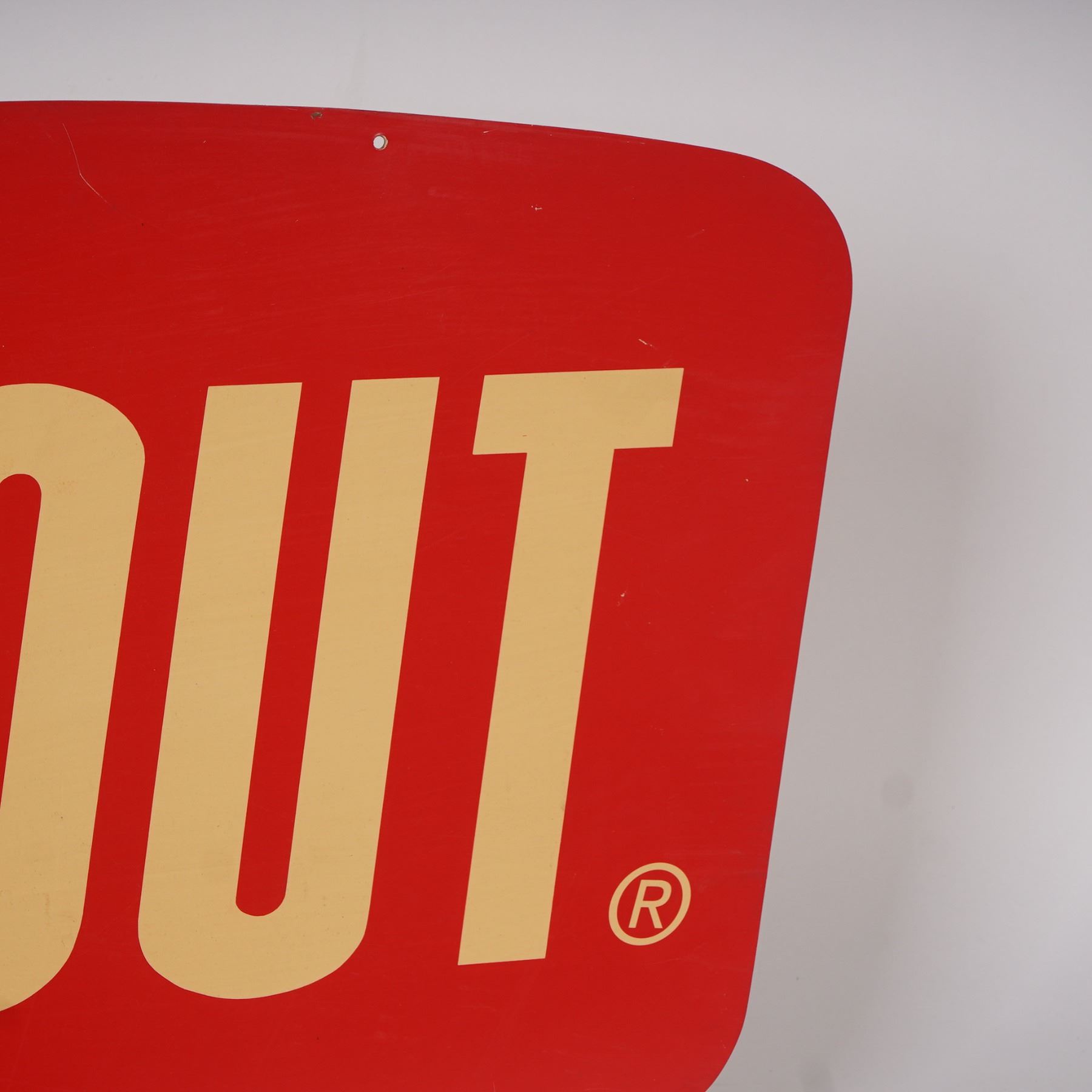Bold red and yellow Gumout embossed metal advertising sign featuring the brand name in large block lettering. The sign has a curved rectangular shape and shows drilled holes for wall mounting. Exhibits expected wear consistent with age and use, including minor surface scratches, oxidation to the back, and scuffs to the front finish. A classic piece of mid-to-late 20th-century automotive advertising.