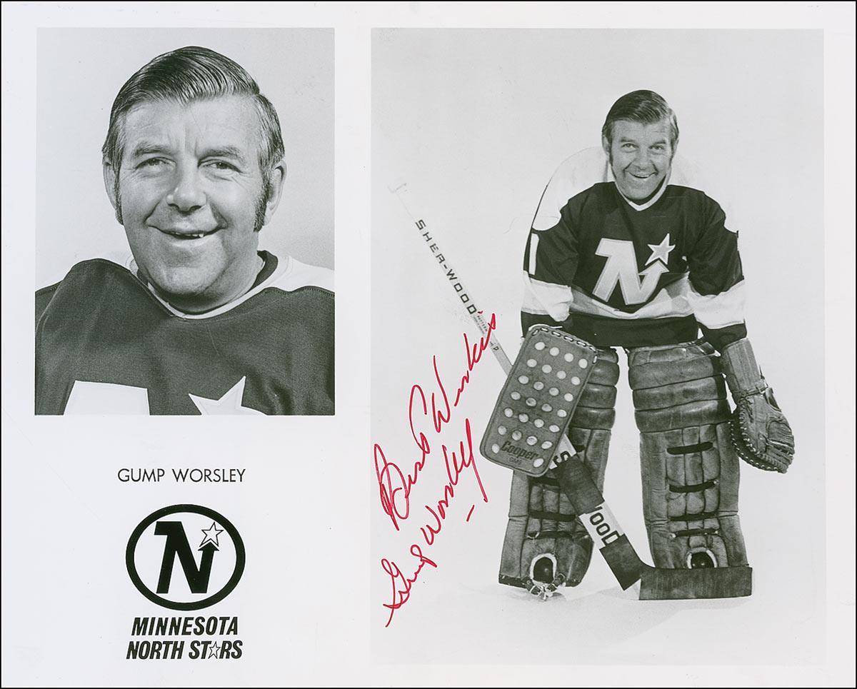 Glossy 10 x 8 Minnesota North Stars promotional photo, signed in red felt tip, “Best Wishes, Gump Worsley.” In fine condition, with a few surface bends and impressions.