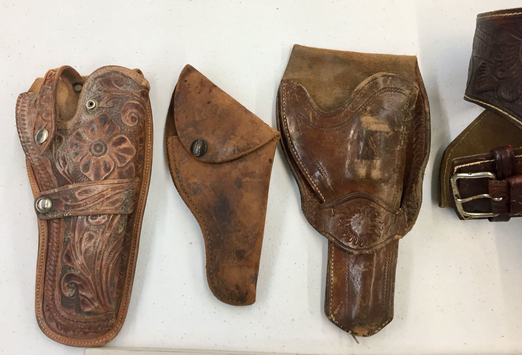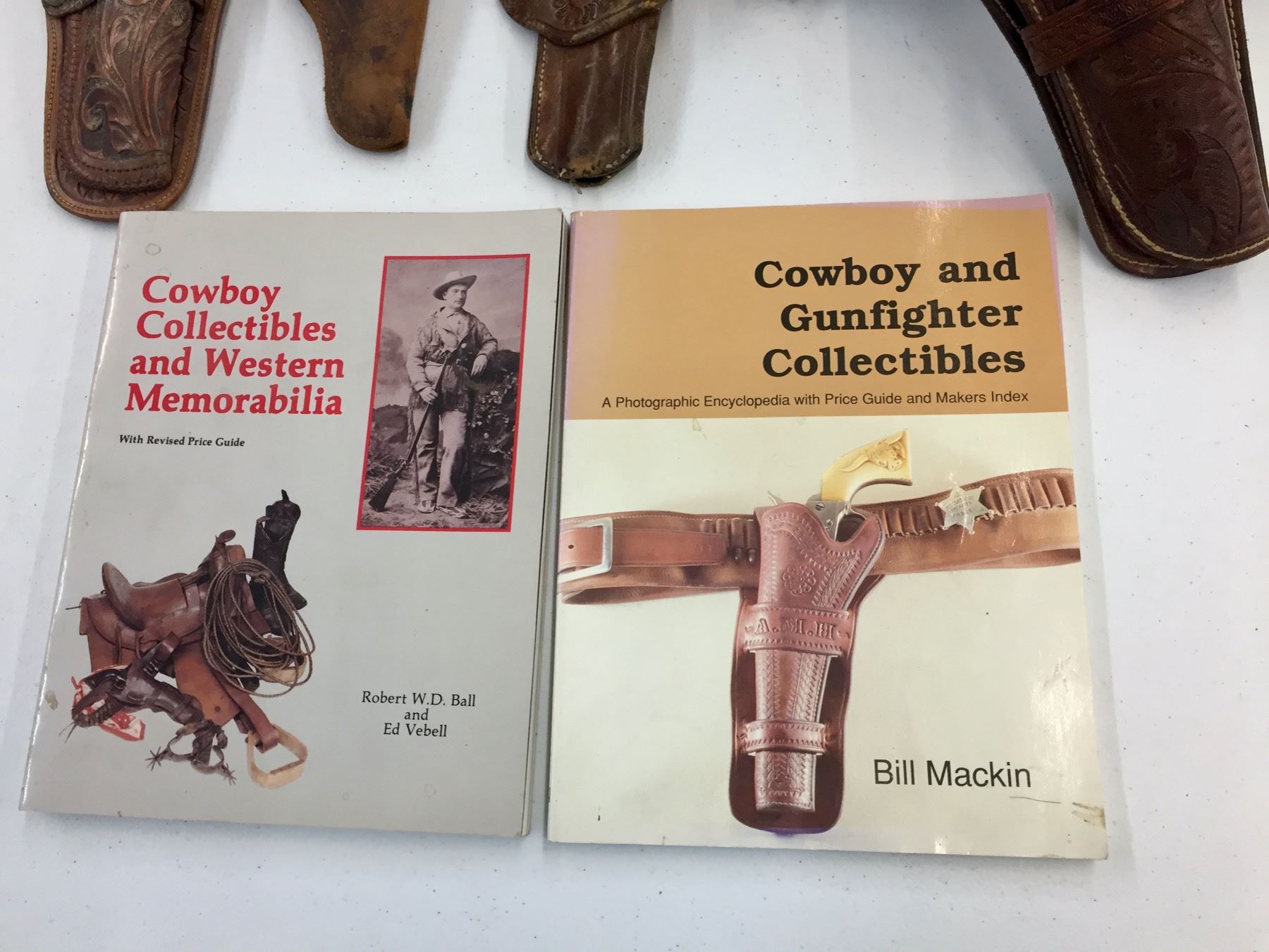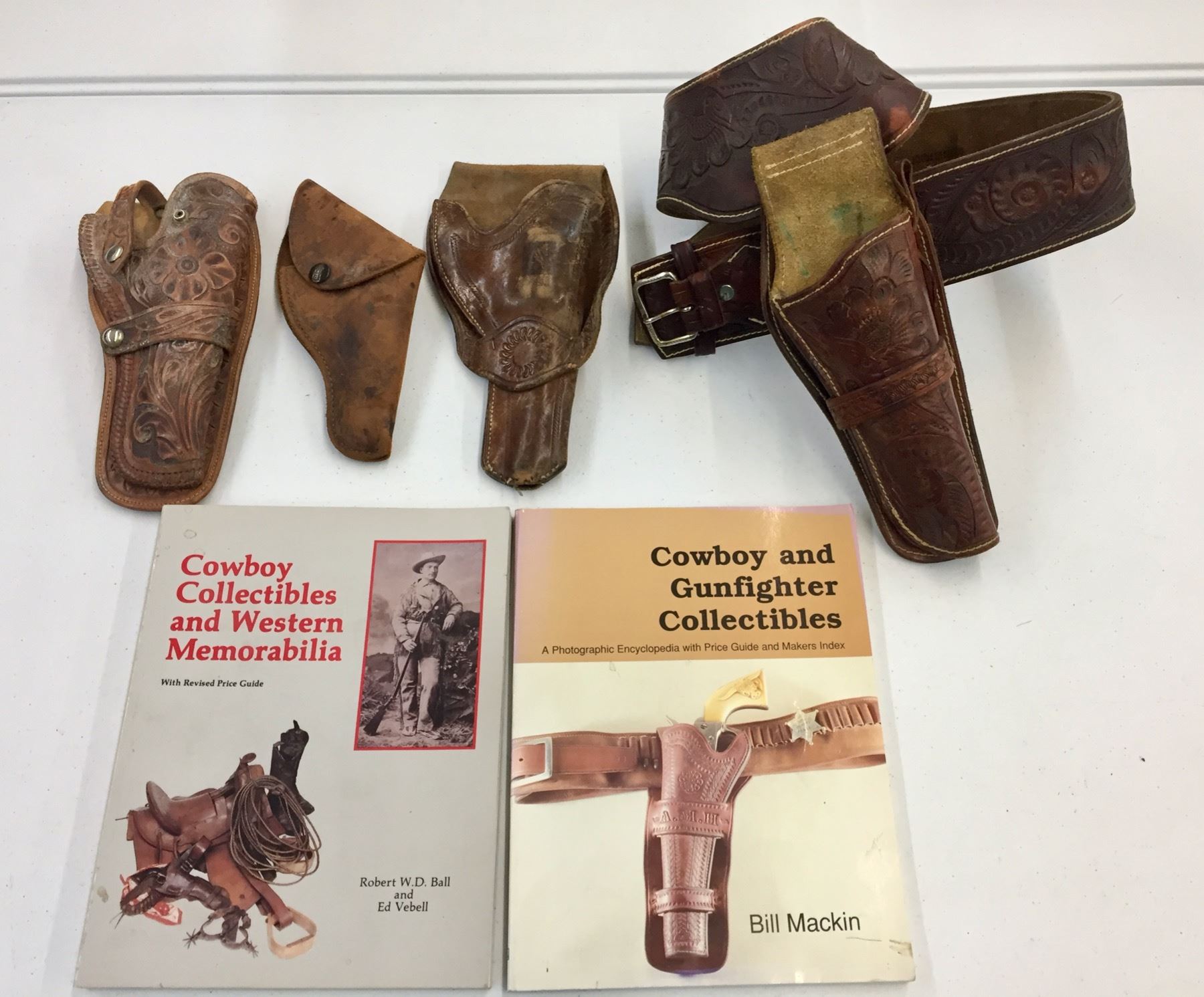 Description: Presented for sale in this lot is a brown leather tooled gun belt and some holsters and two books about Cowboy and Gunfighter collectibles. Maker: Various. Approx. Age: Vintage to modern. Size: Gun Belt measures 43â€. Condition: Pretty good for their ages, normal wear expected. Please look closely at the pictures - they are an important part of our description. Shipping: There will be a $10 handling / packaging fee for shipping this lot. The actual cost of postage will be added on top of that.
