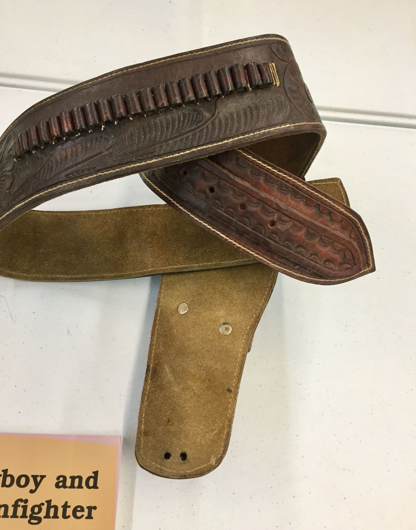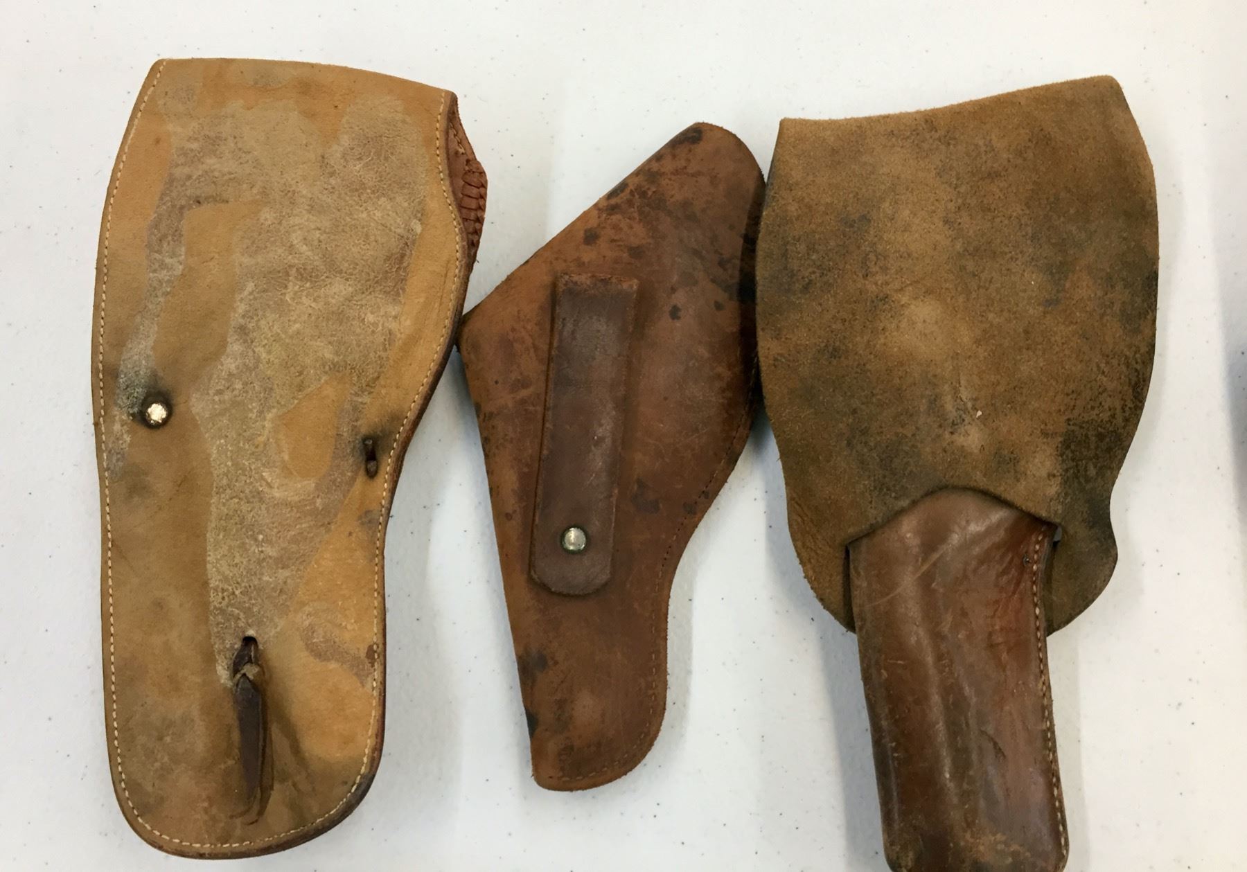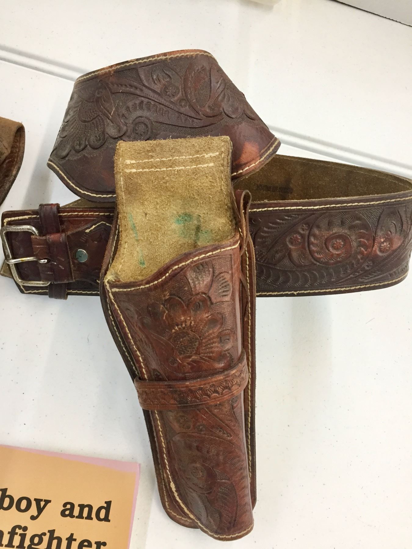 Description: Presented for sale in this lot is a brown leather tooled gun belt and some holsters and two books about Cowboy and Gunfighter collectibles. Maker: Various. Approx. Age: Vintage to modern. Size: Gun Belt measures 43â€. Condition: Pretty good for their ages, normal wear expected. Please look closely at the pictures - they are an important part of our description. Shipping: There will be a $10 handling / packaging fee for shipping this lot. The actual cost of postage will be added on top of that.