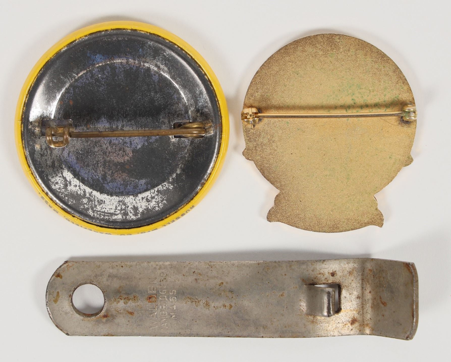 Gun club pins. Good condition, pin mechanisms still work and appear to be sturdy. Golden pin measures 1.5" across, yellow pin measures 1.75" across, & bottle opener measures 3" in length with a keychain hole about the size of a hole punch. See photo.