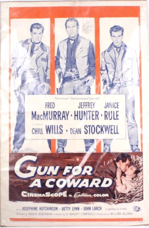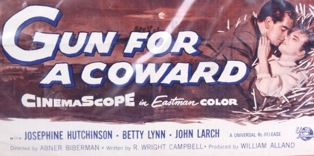 This lot features a movie poster, Gun For a Coward. A young cowboy, whose dedication to the principles of peace and reason has earned him a reputation for cowardice, overcomes his psychological aversion to violence afterhis elder brother unjustly censures him for not joining in a foolhardy gunfight in which their youngest brother is killed. This poster is in original condition. It measures 27" x 41"