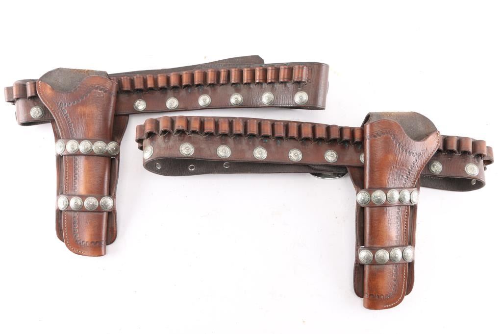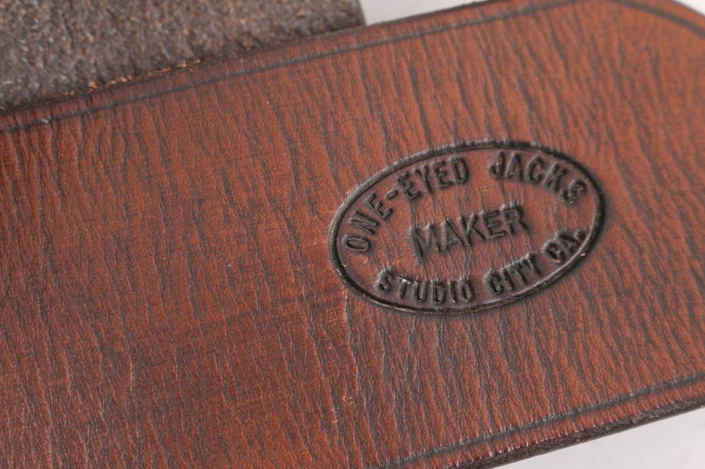 Includes 2 single holster rigs, left and right hand. Maker stamped "ONE-EYED JACKS, STUDIO CITY, CA.", both with conchos & chrome-colored buckles.