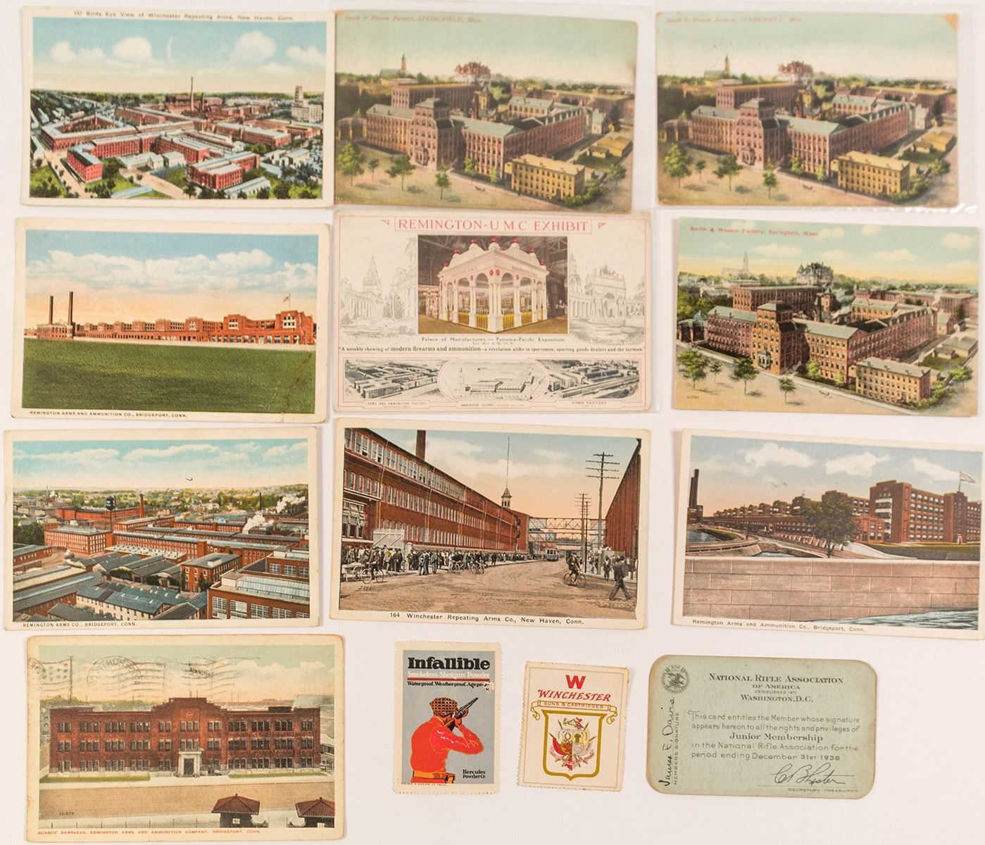One Junior Membership card to the National Rifle Association from 1938. Ten postcards from various American gun makers: Smith & Wesson, Winchester and Remington. Two stamps from Winchester and Hercules Powder Co. Date: Location: HWAC# 52425