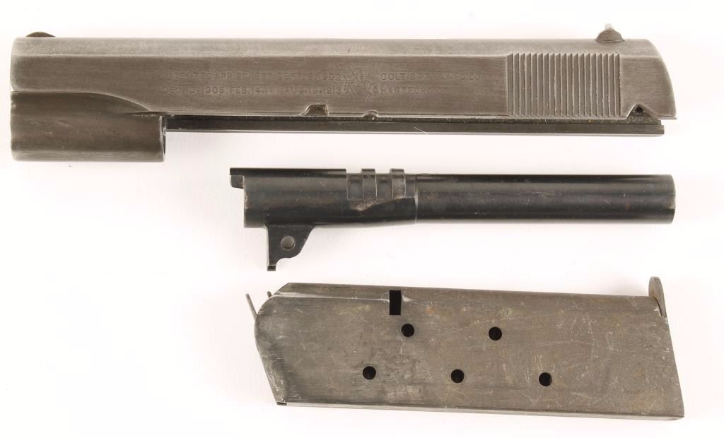 Including a Colt 1911 slide, magazine and Colt 45 barrel. Condition overall fair to good, magazine in poor condition as it is partly corroded.