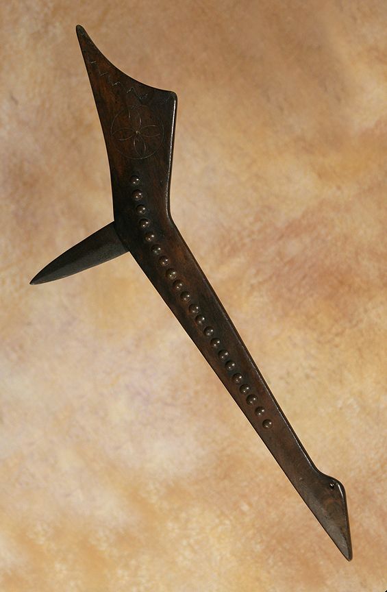 Gun-Stock Club. 25" long club with a 5" long iron spike/blade. Wood shows beautiful patination. Tacked & carved on both sides. Circa 1890. (est. $2,000-3,000). CONDITION REPORTS: www.auctioninsantafe.com/docs/cr2012.pdf
