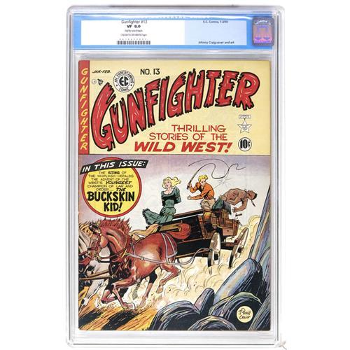 <B>Gunfighter #13 (EC, 1950) CGC VF 8.0 Cream to off-white pages.</B></I> Johnny Craig cover. Interior art by Craig, "Harry Wood" (i.e. Wally Wood and Harry Harrison), and Fred Peters. CGC notes, "Slightly rusted staple." Overstreet 2006 VF 8.0 value = $239. CGC census 5/06: 1 in 8.0, 1 higher. <BR><BR><B>Important notice:</B> Heritage usually auctions material at the rate of 200-250 lots per hour. On some occasions eBay Live bid software or the Internet may not be able to keep up with the pace of the auction. We recommend placing a realistic absentee bid now as insurance to avoid disappointment. Occasionally the auctioneer may eliminate or reject an eBay Live bid, and the auctioneer may also reopen a lot after the close of the eBay live bidding (usually because we missed an audience bid), and may reject your bid even if it shows you as the winning bidder. By bidding via eBay Live, you agree that Heritage may award the lot to another bidder at its sole discretion under the circumstances described above or any other reasonable circumstances. Since eBay bids are not shown to us until we open the lot on the floor, we treat those bids just like floor bids. In most cases the floor responds before the eBay bid is presented to us, due to Internet lag time, so for consistency we have made it a policy that floor bids are always considered first over tie eBay live bids. Also please note that all Heritage lots purchased through eBay Live carry a 22.5% Buyer's Premium. Please make sure you read the Terms and Conditions before you bid. This lot is being auctioned in conjunction with a live floor auction by Heritage Auction Galleries. All final auction and invoice information will be supplied by Heritage Auction Galleries, and all other information should be considered preliminary. Lot:41001 <BR><BR><B>Winning Notification and Billing:</B> After the FINAL session in this auction is complete, Heritage will send e-mail and snail mail invoices. This process normally takes several days. All final auction and invoice information will be supplied by Heritage Auction Galleries, and all other information should be considered preliminary. <BR><BR>This auction will be conducted on a live auction floor and over the Internet through eBay Live. If you choose to place an absentee bid, please take a moment to <font color='#0000ff'><u><a href='http://pages.ebay.com/liveauctions/help/before/laabsentee.html'>learn how eBay Live absentee bidding works</a></u></font><font color='#000000'>
