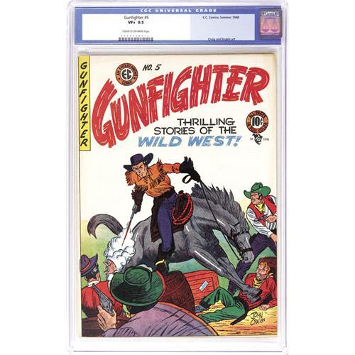 <B>Gunfighter #5 (EC, 1948) CGC VF+ 8.5 Cream to off-white pages.</B></I> This is the nicest copy we've ever offered of the first issue of this Pre-Trend title. The title character was drawn by Johnny Craig on the cover and Graham Ingels inside the book. Craig also handled the adventure of the Buckskin Kid. A couple of oddities here: the series numbering was continued from <B>Fat and Slat</B></I>, and a backup feature stars none other than EC's only superheroine, Moon Girl, in a story with a "ghost town" theme. Overstreet 2006 VF 8.0 value = $340; VF/NM 9.0 value = $533. CGC census 5/06: 1 in 8.5, 2 higher. <BR><BR><B>Important notice:</B> Heritage usually auctions material at the rate of 200-250 lots per hour. On some occasions eBay Live bid software or the Internet may not be able to keep up with the pace of the auction. We recommend placing a realistic absentee bid now as insurance to avoid disappointment. Occasionally the auctioneer may eliminate or reject an eBay Live bid, and the auctioneer may also reopen a lot after the close of the eBay live bidding (usually because we missed an audience bid), and may reject your bid even if it shows you as the winning bidder. By bidding via eBay Live, you agree that Heritage may award the lot to another bidder at its sole discretion under the circumstances described above or any other reasonable circumstances. Since eBay bids are not shown to us until we open the lot on the floor, we treat those bids just like floor bids. In most cases the floor responds before the eBay bid is presented to us, due to Internet lag time, so for consistency we have made it a policy that floor bids are always considered first over tie eBay live bids. Also please note that all Heritage lots purchased through eBay Live carry a 22.5% Buyer's Premium. Please make sure you read the Terms and Conditions before you bid. This lot is being auctioned in conjunction with a live floor auction by Heritage Auction Galleries. All final auction and invoice information will be supplied by Heritage Auction Galleries, and all other information should be considered preliminary. Lot:41001 <BR><BR><B>Winning Notification and Billing:</B> After the FINAL session in this auction is complete, Heritage will send e-mail and snail mail invoices. This process normally takes several days. All final auction and invoice information will be supplied by Heritage Auction Galleries, and all other information should be considered preliminary. <BR><BR>This auction will be conducted on a live auction floor and over the Internet through eBay Live. If you choose to place an absentee bid, please take a moment to <font color='#0000ff'><u><a href='http://pages.ebay.com/liveauctions/help/before/laabsentee.html'>learn how eBay Live absentee bidding works</a></u></font><font color='#000000'>